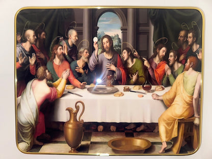 The 5571-10 art frame is a compact display solution designed to elegantly showcase a representation of the Last Supper of Jesus. Featuring a built-in stand, it offers stable support for tabletop or shelf placement, enhancing the artwork's visibility and presence in any setting. Its small size allows for versatile positioning while maintaining a refined, professional presentation suitable for religious or historical art displays.