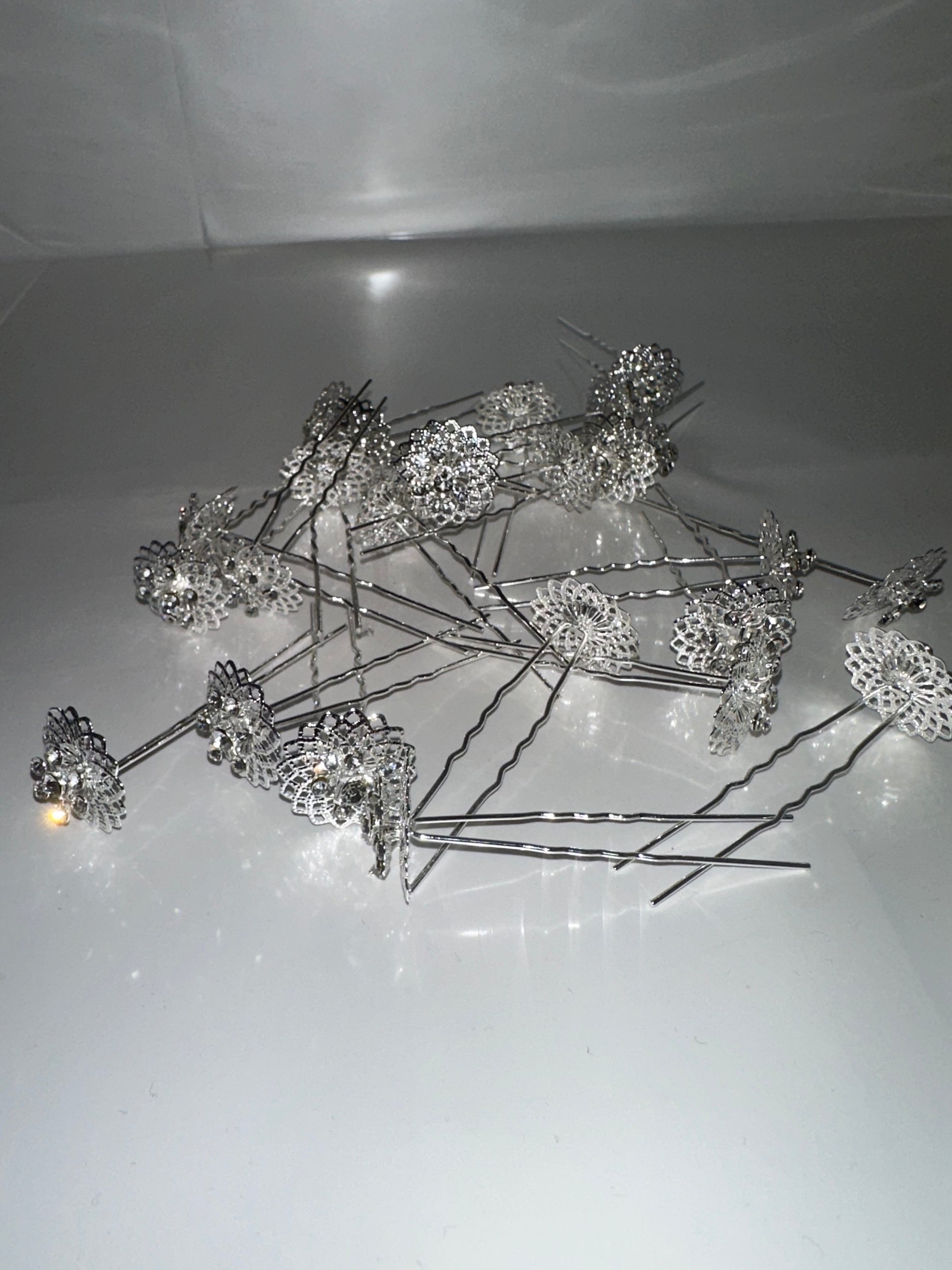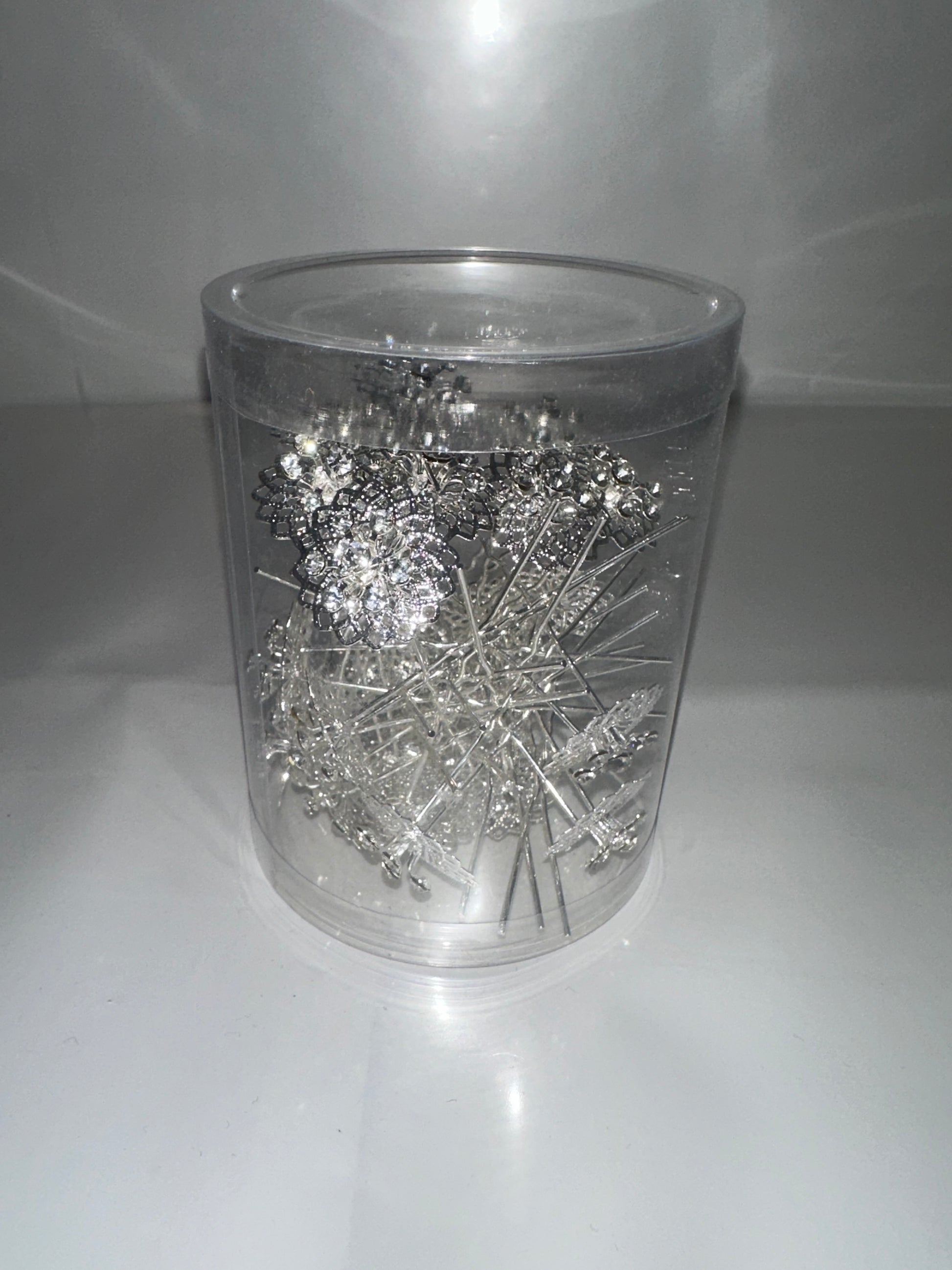 Enhance your floral arrangements with Flower Pins. Each cylinder container contains 24 pins in silver, making it perfect for any occasion. Add a unique touch to your flower decorations with these expertly crafted pins.