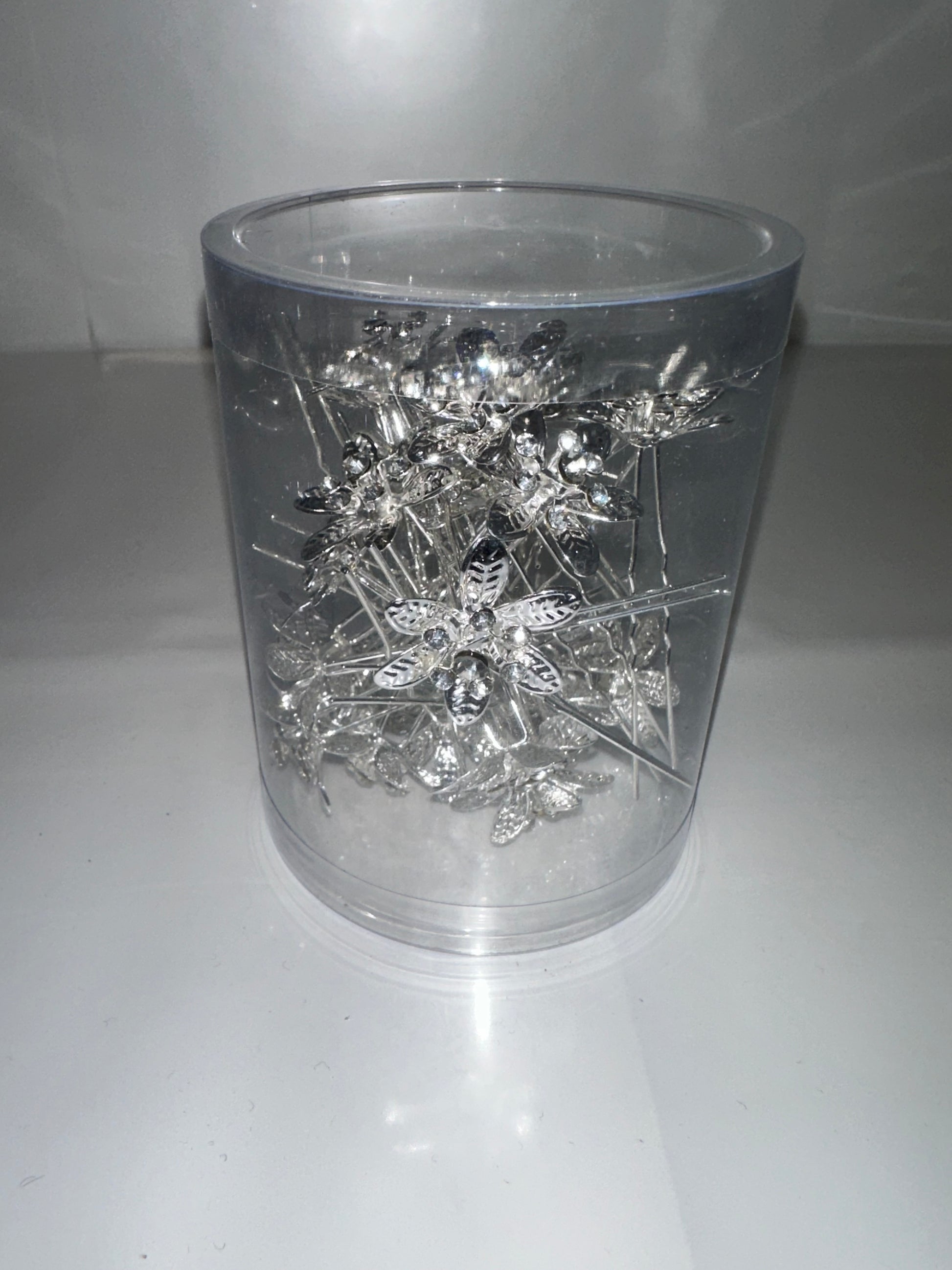 Enhance your floral arrangements with Flower Pins. Each cylinder container contains 24 pins in silver, making it perfect for any occasion. Add a unique touch to your flower decorations with these expertly crafted pins.