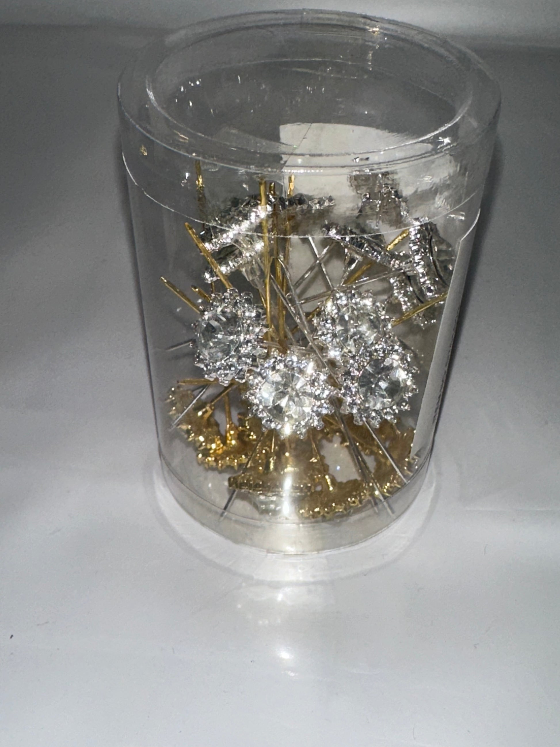 Enhance your floral arrangements with Flower Pins. Each cylinder container contains 24 pins in silver and gold , making it perfect for any occasion. Add a unique touch to your flower decorations with these expertly crafted pins.