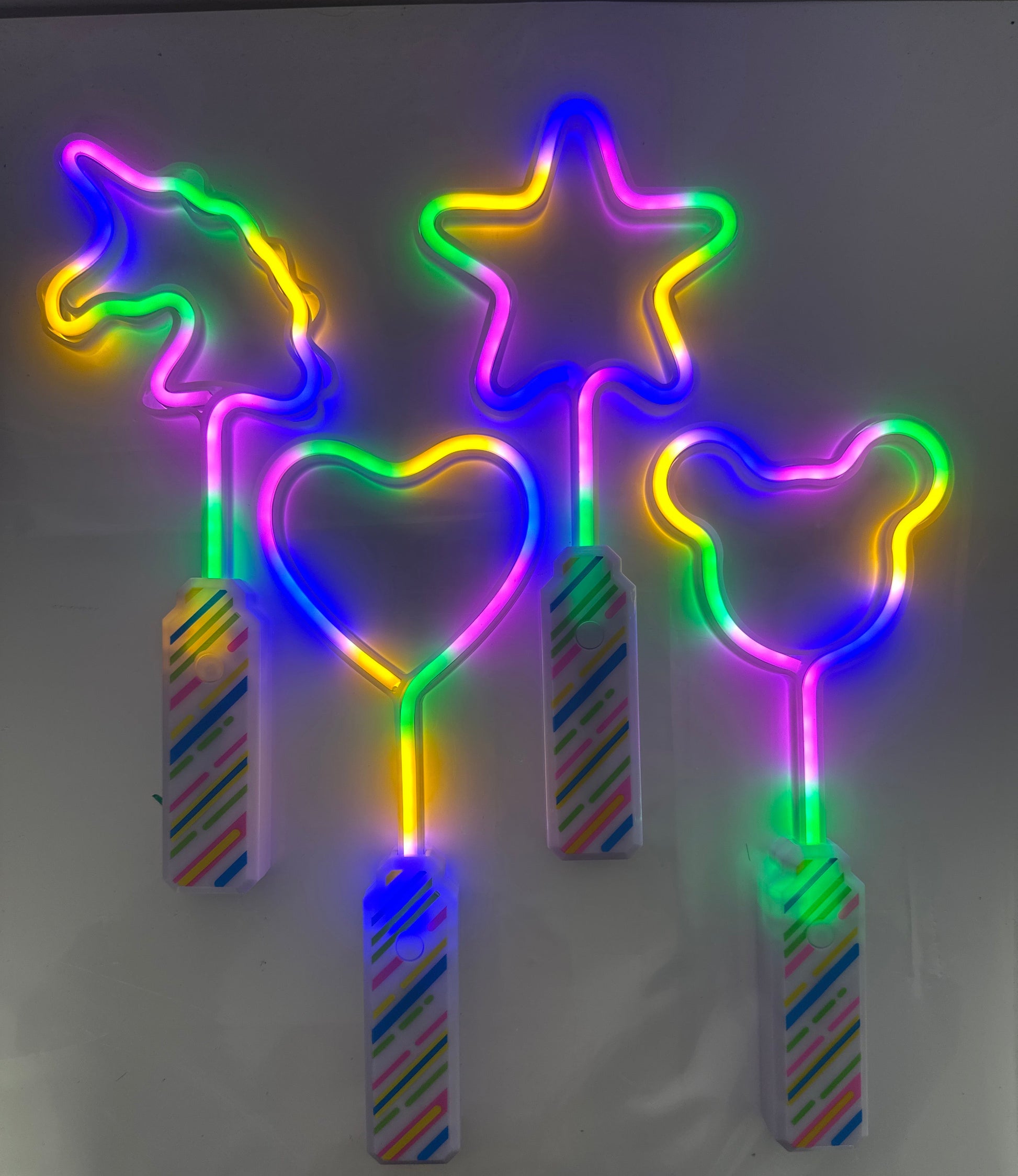 Brighten up any space with our HP-6697/5901 Neon Lights Mix (12pc). This set features small, handheld neon lights in fun shapes like unicorn heads, stars, hearts, and mouse. Perfect for adding a playful glow to parties, bedrooms, or creative projects. Compact and easy to hold, these lights bring instant charm and vibrant color wherever you place them. Make your environment pop with these eye-catching neon designs.