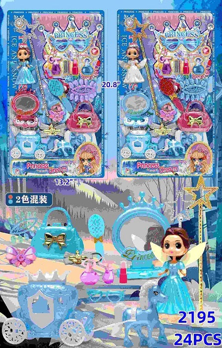 Enhance your child's imagination with Princess #2195. This play set comes complete with a wand, nails, purse, and a miniature doll and carriage. Let your child explore their royal side while developing their creativity. Don't forget the mirror for the perfect finishing touch.