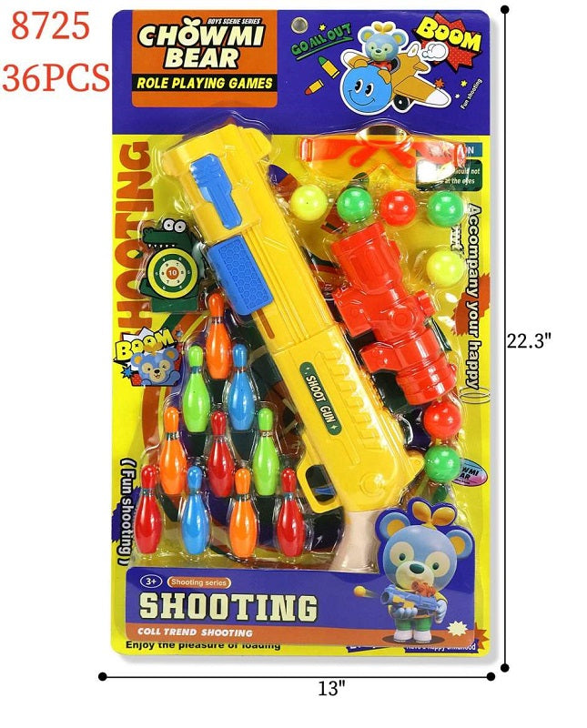 The Shooting series #8725 offers a thrilling experience for all ages. With its manual pull back gun, you can shoot ping pong balls at bowling pin targets with precision. Made of durable plastic, this toy guarantees endless fun and helps improve hand-eye coordination. Perfect for developing accuracy and skill!