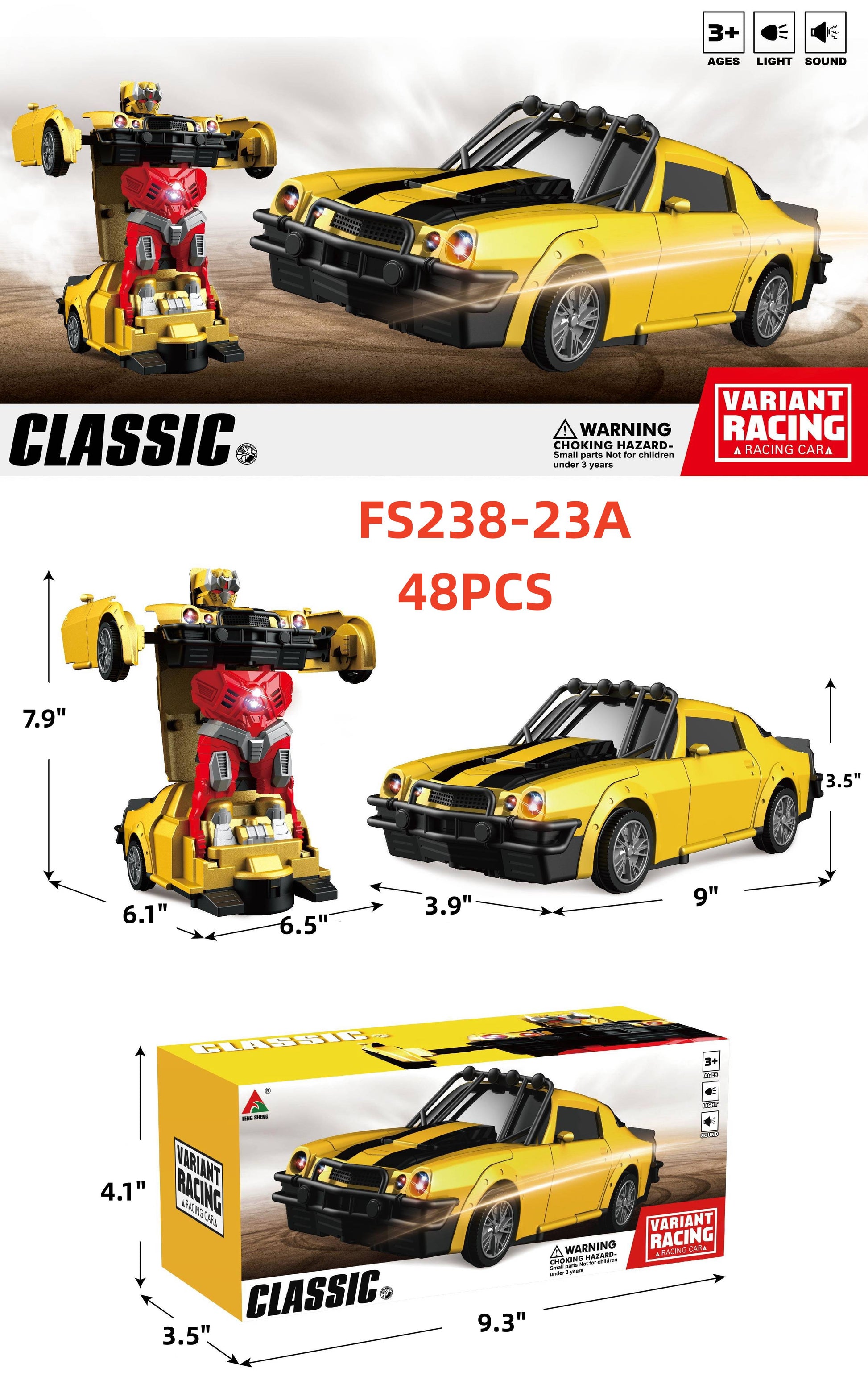 Introducing the Variant Racing #FS238-23 - the ultimate toy car for kids! With lights and sounds, it's sure to keep them entertained. But wait, there's more - it moves on its own and transforms into a robot while in motion! Perfect for imaginative play and fostering motor skills.